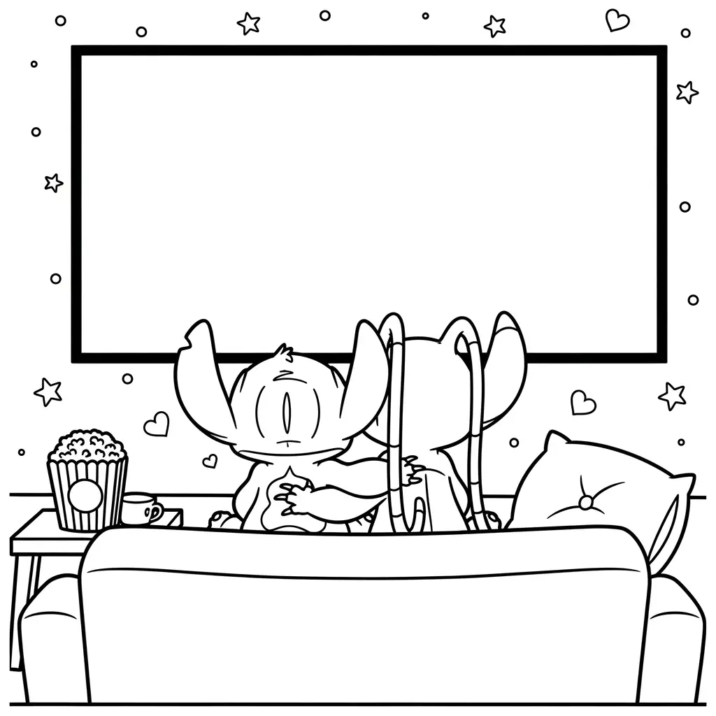 Desenho do Stitch e Angel assistindo filmes para colorir