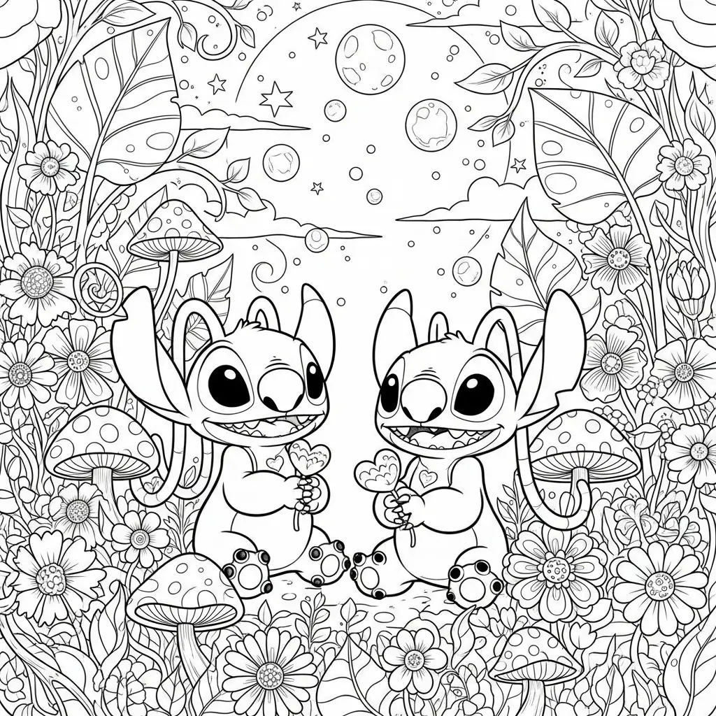 Desenho do Stitch e Angel em um jardim mágico para colorir