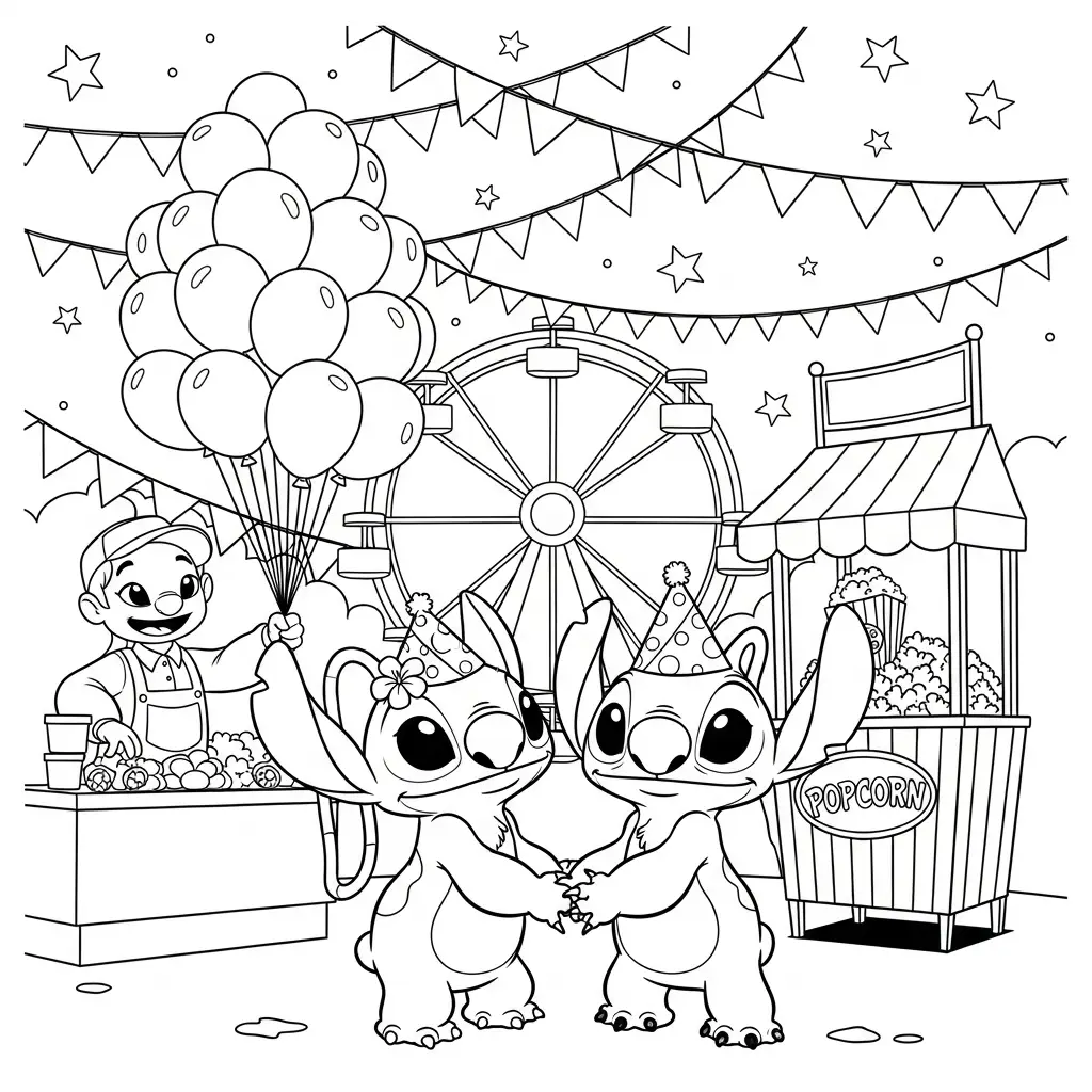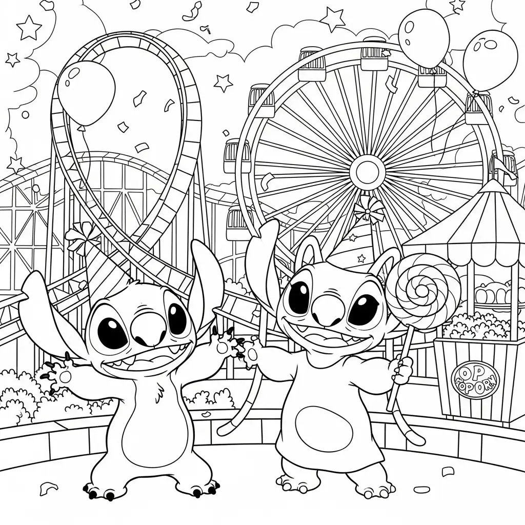 Desenho do Stitch e Angel em um parque de diversões para colorir