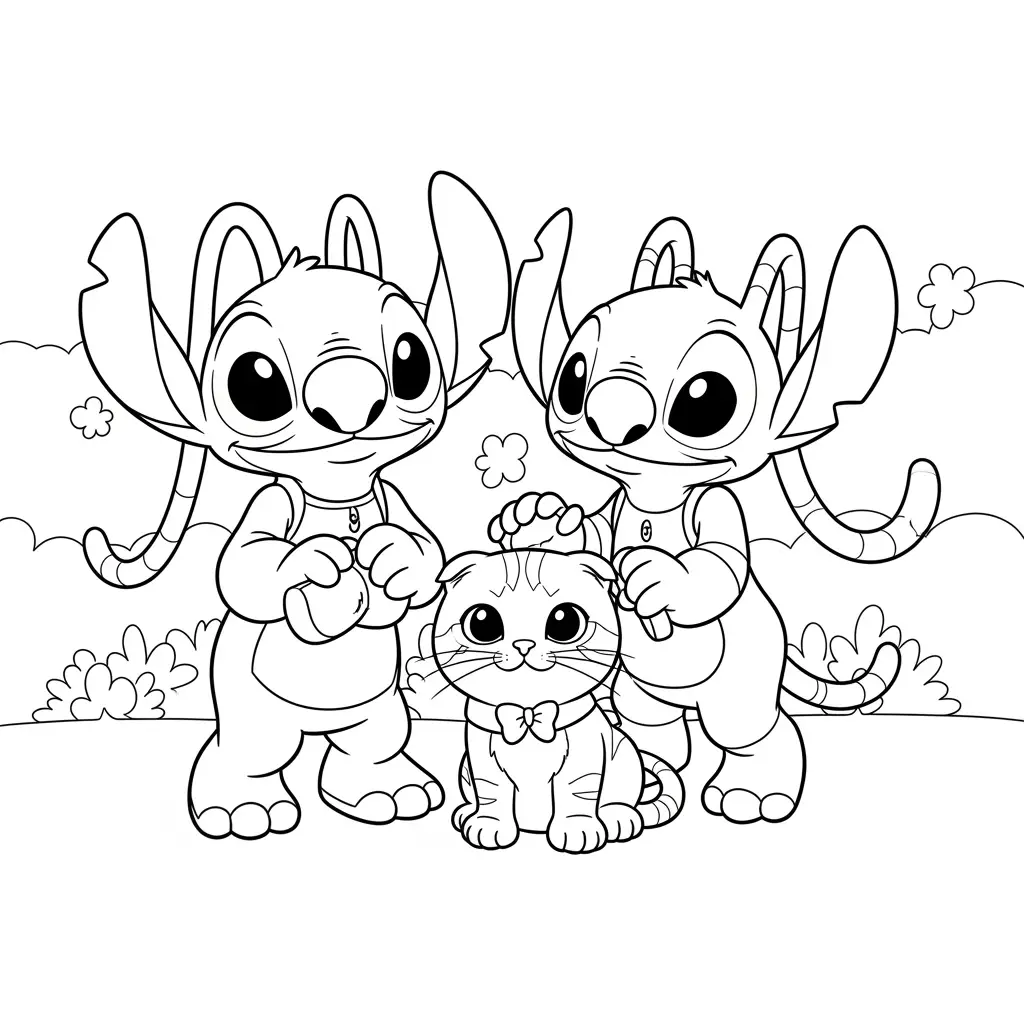 Desenho do Stitch e Angel em um scottish fold para colorir