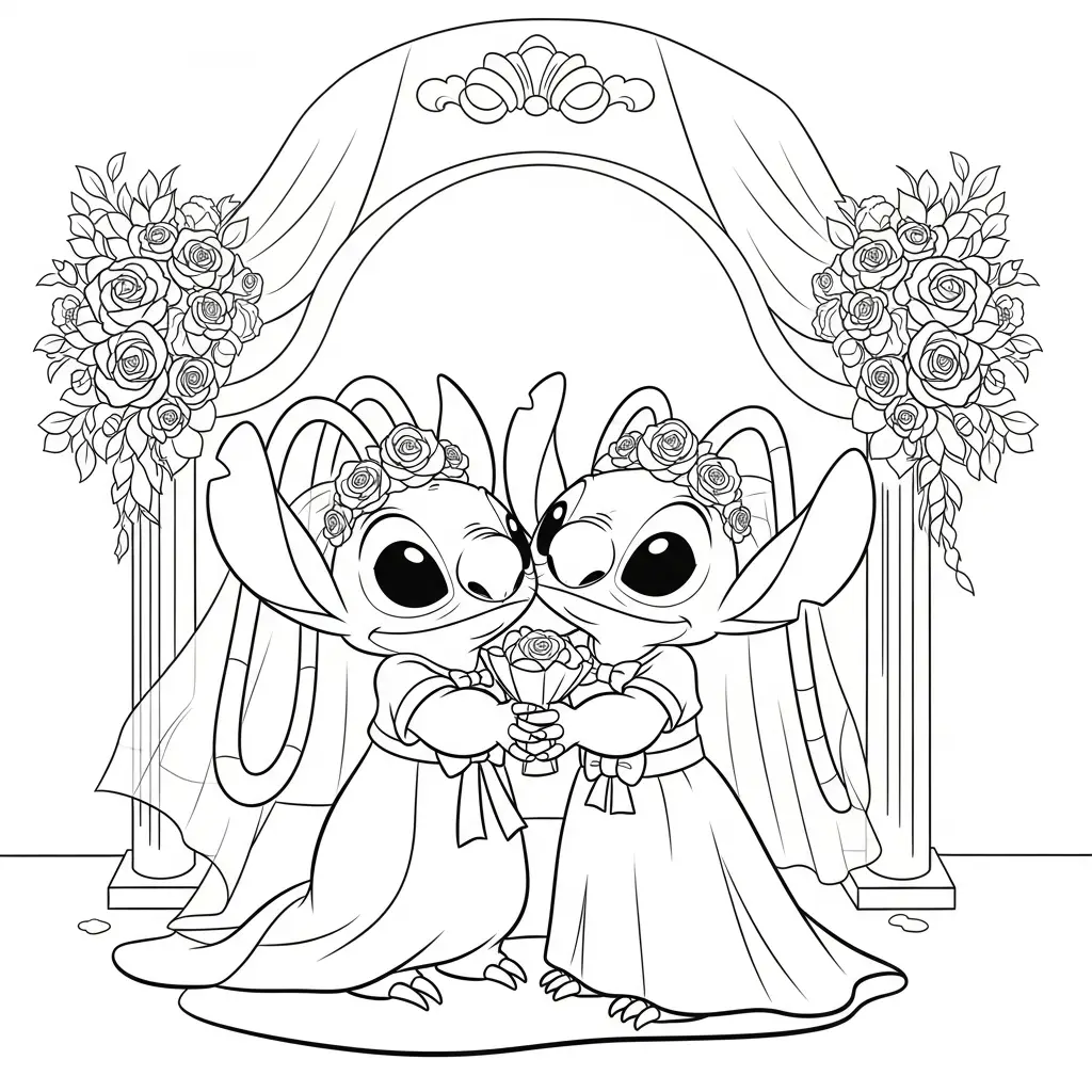 Desenho do Stitch e Angel em uma festa de casamento para colorir