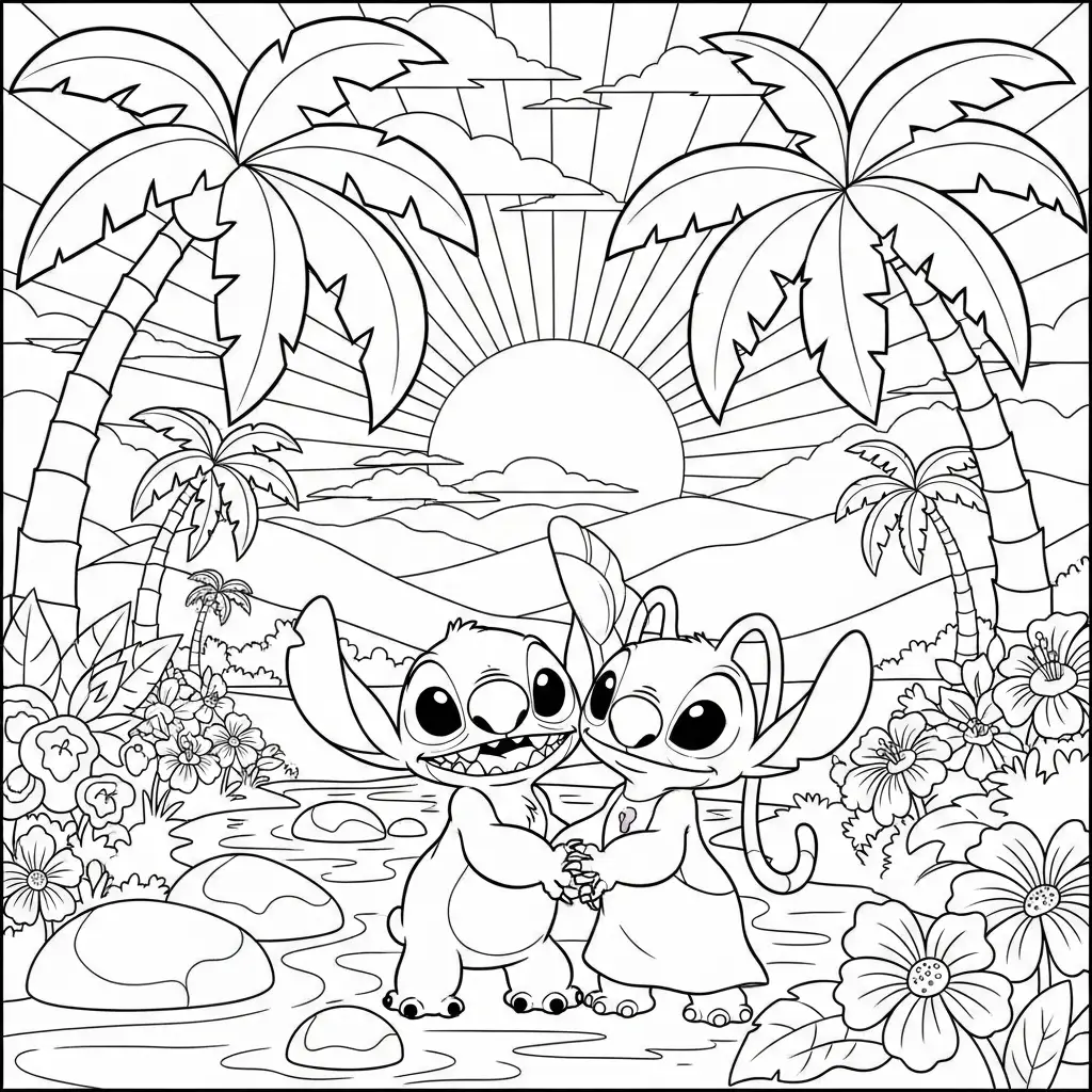 Desenho do Stitch e Angel em uma linda paisagem para colorir