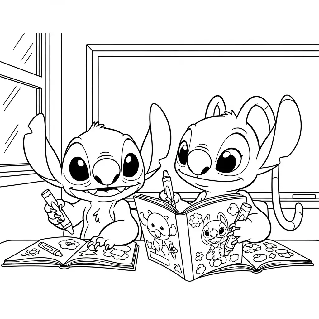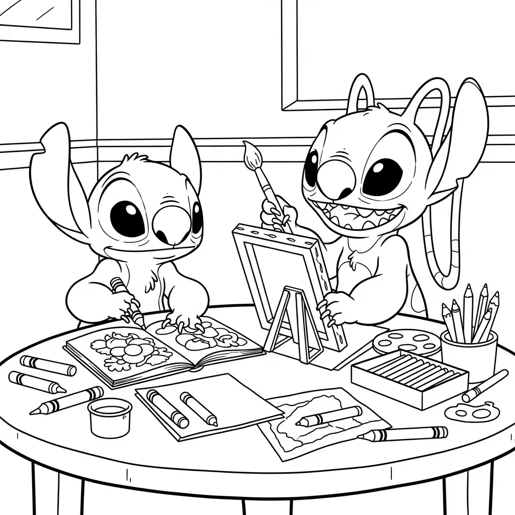 Desenho do Stitch e Angel fazendo artesanato para colorir