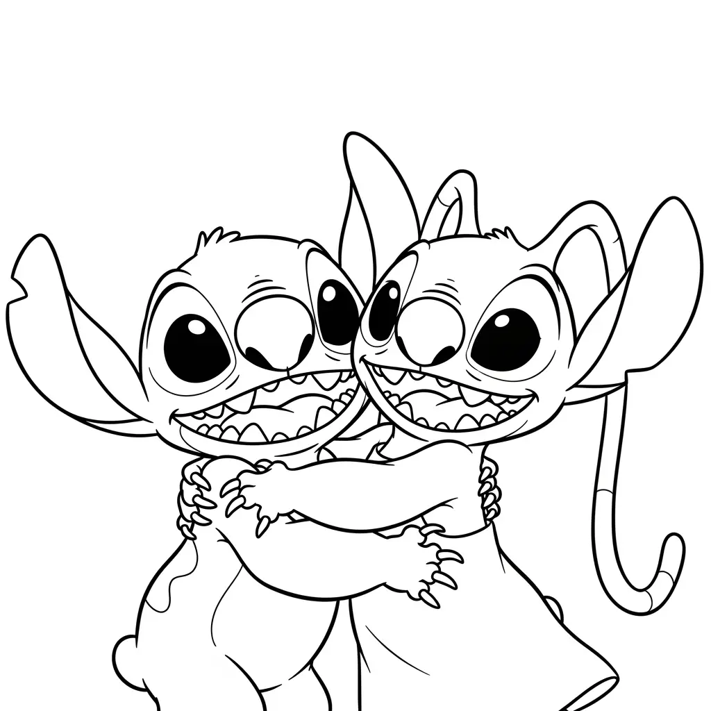 Desenho do Stitch e Angel se abraçando feliz para colorir