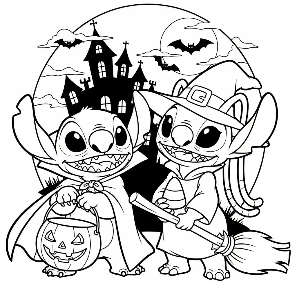 Desenho do Stitch e Angel se preparando para o Halloween para colorir