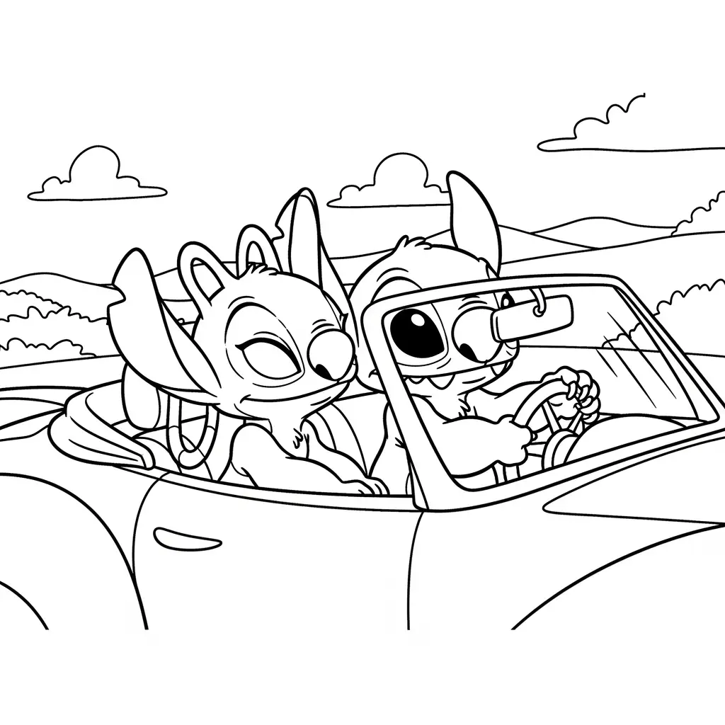 Desenho do Stitch e Angel viajando em um carro para colorir